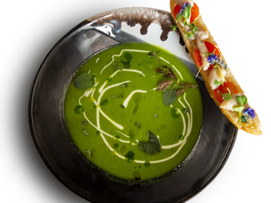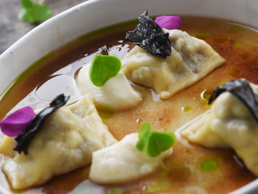 piščančja juha s kroparskim krapcem, polnjenim s piščančjimi jetri, jušna zelenjava