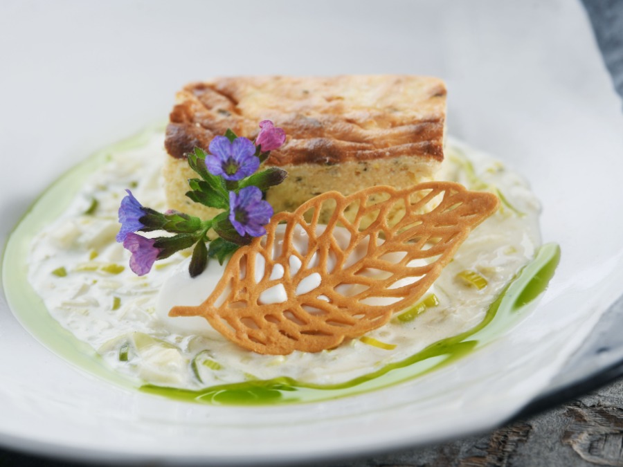 z Golarjevo skuto, Darjino proseno kašo, dimljeno hruško, medenim kisom vege omaka, špinačna krema, bela vložena jagoda